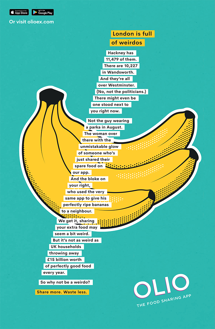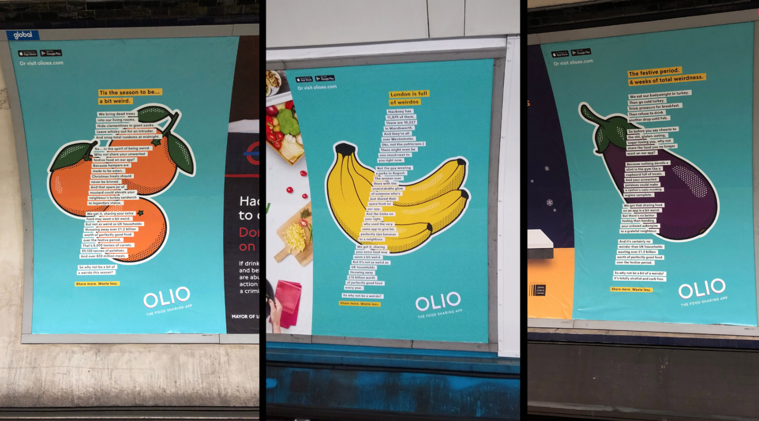 OLIO, the food sharing app, wanted a new identity and brand voice. The challenge was to change the mindset of London and re-educate them about food waste.